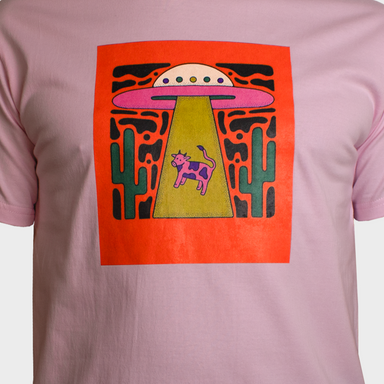 View full detailsT-SHIRT: UFO & COW – NNARA Selection A pop culture icon: a cow abducted by a flying saucer, suspended in a psychedelic desert. Absurdity become...